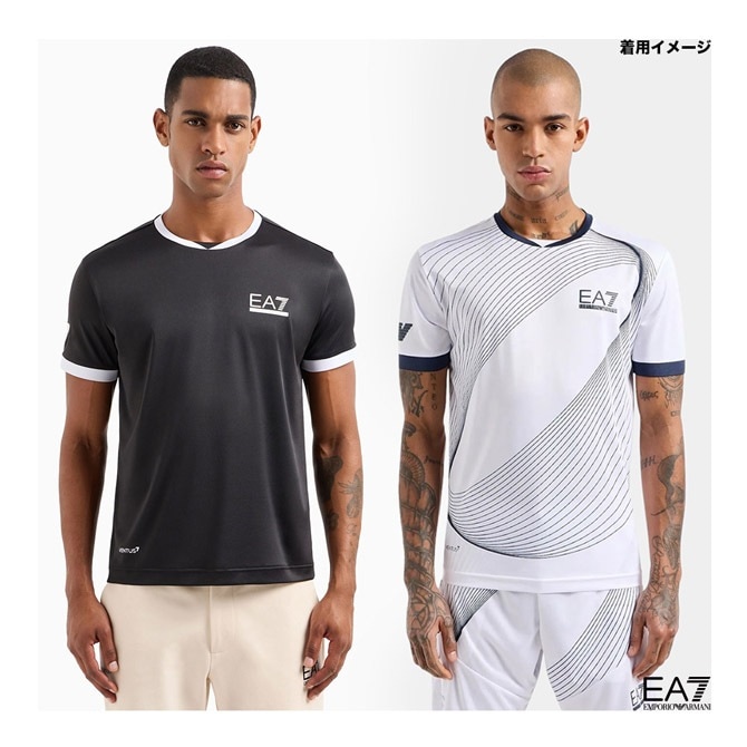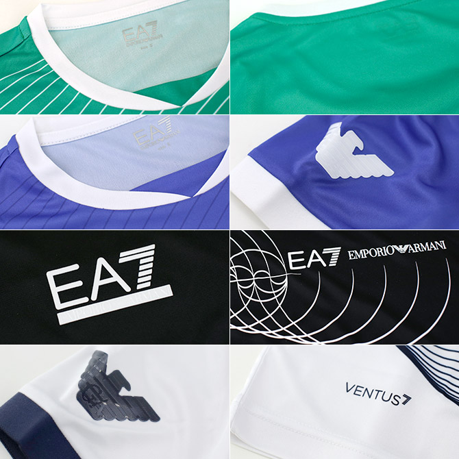 ウェアにテニスモチーフのプリント、一方の袖にイーグルロゴ、胸にコントラストの効いたEA7ロゴをあしらい、オリジナリティをプラスしました。